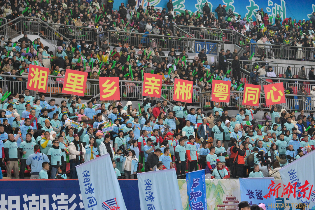 2025年9月深圳福田的巨幕广告上,“乡愁是一张9.8元的湘超球票”的召唤直击人心,微博话题#深圳巨幅大屏喊湖南老乡回家看球#连续两日霸榜湖南各市州微博同城热搜。国庆前后的赛事中,数百名大湾区球迷来到郴州组成助威方阵,到了2026年元旦假期,更多大湾区球迷登上Y888次“球迷旅游专列”向郴州汇聚。