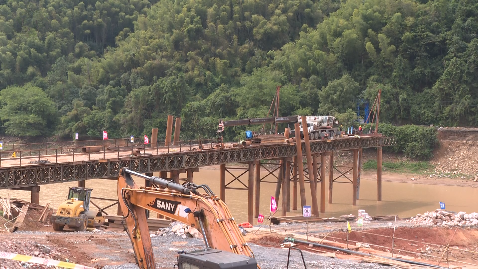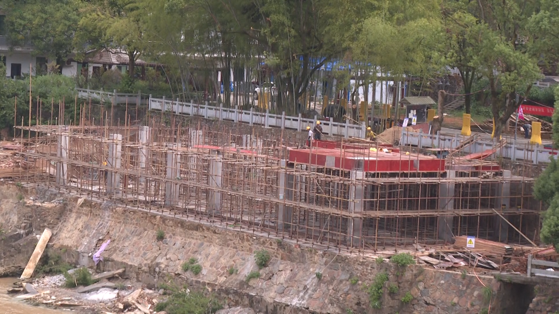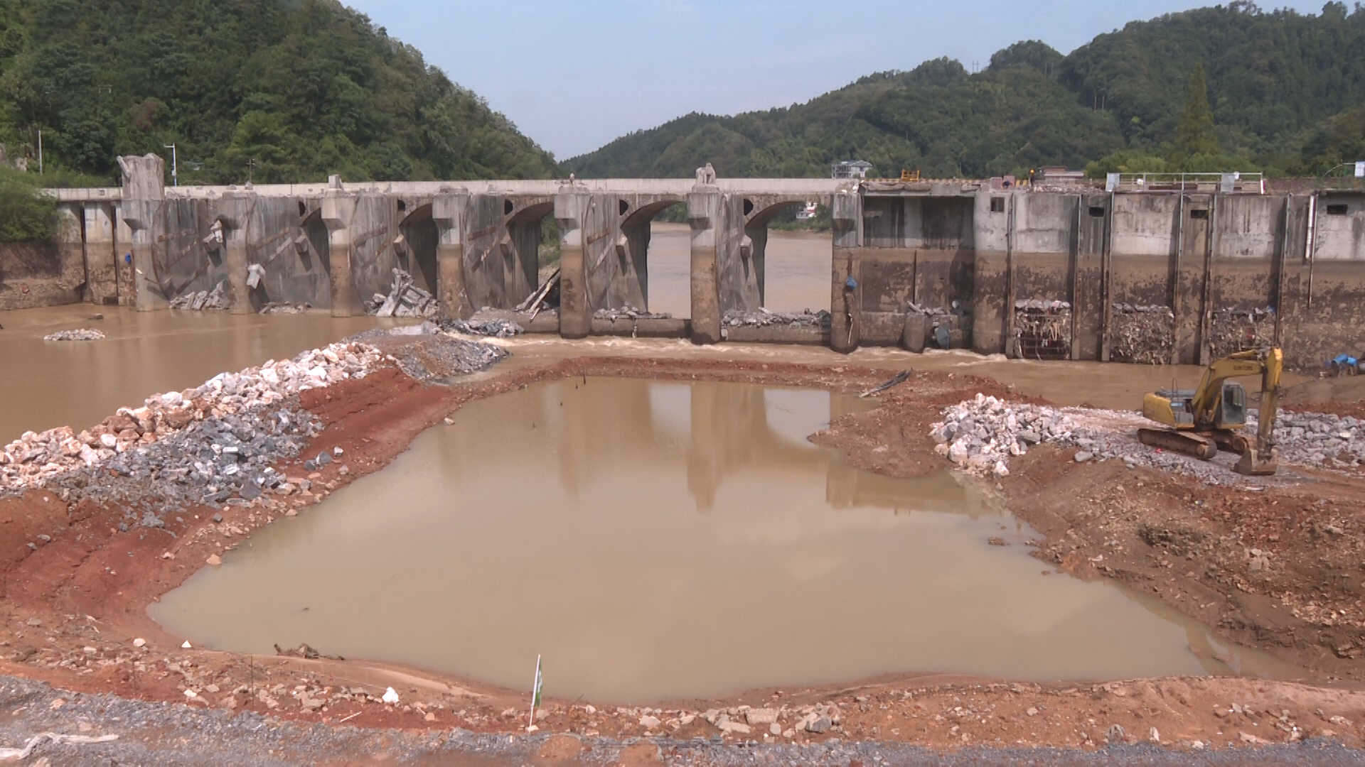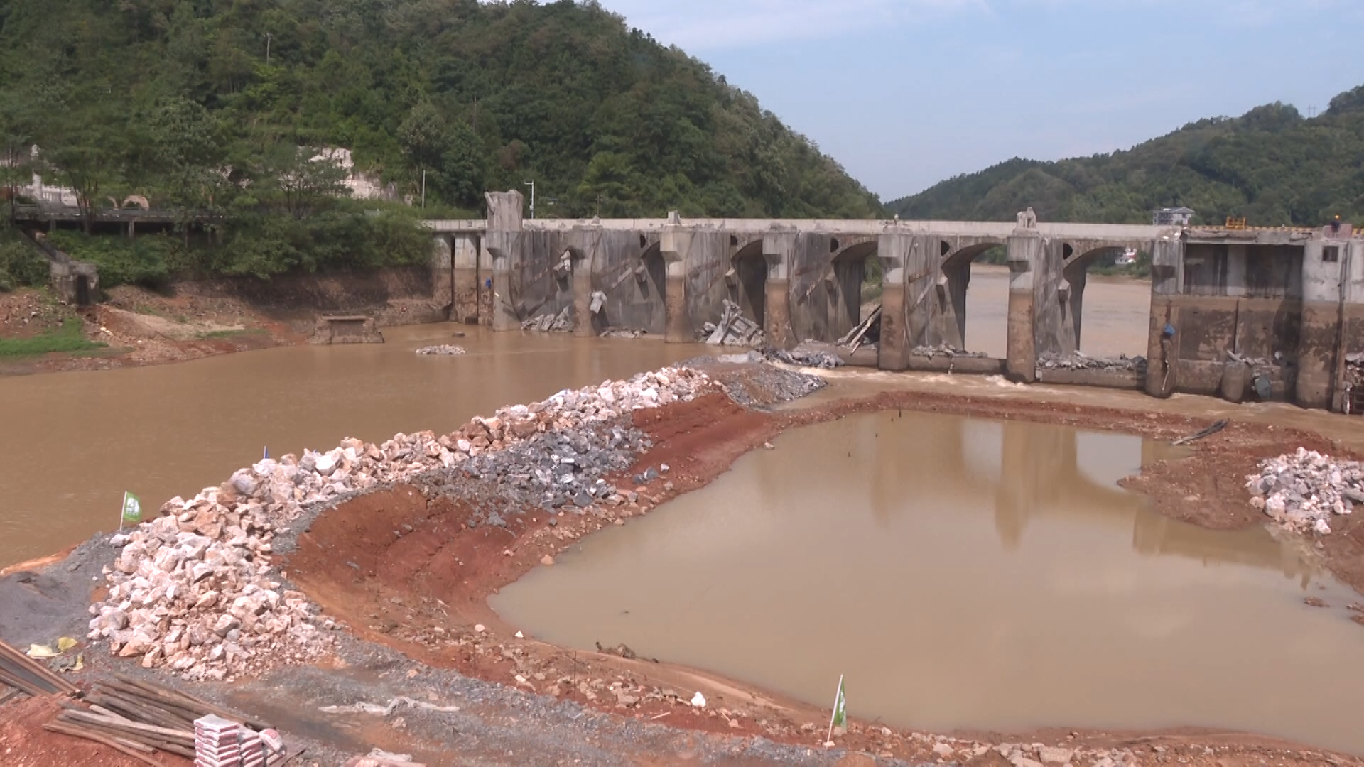 安仁县水利局项目现场负责人 陈旭辉:目前已完成下游管理用房的拆除及重建,上游围堰的填筑,临时钢栈桥的架设,大坝弧形闸门、启闭机等金结设施的拆除,大坝闸门启闭房屋及排架的拆除,交通桥梁台的预制等工作,目前工程进度大概20%左右。